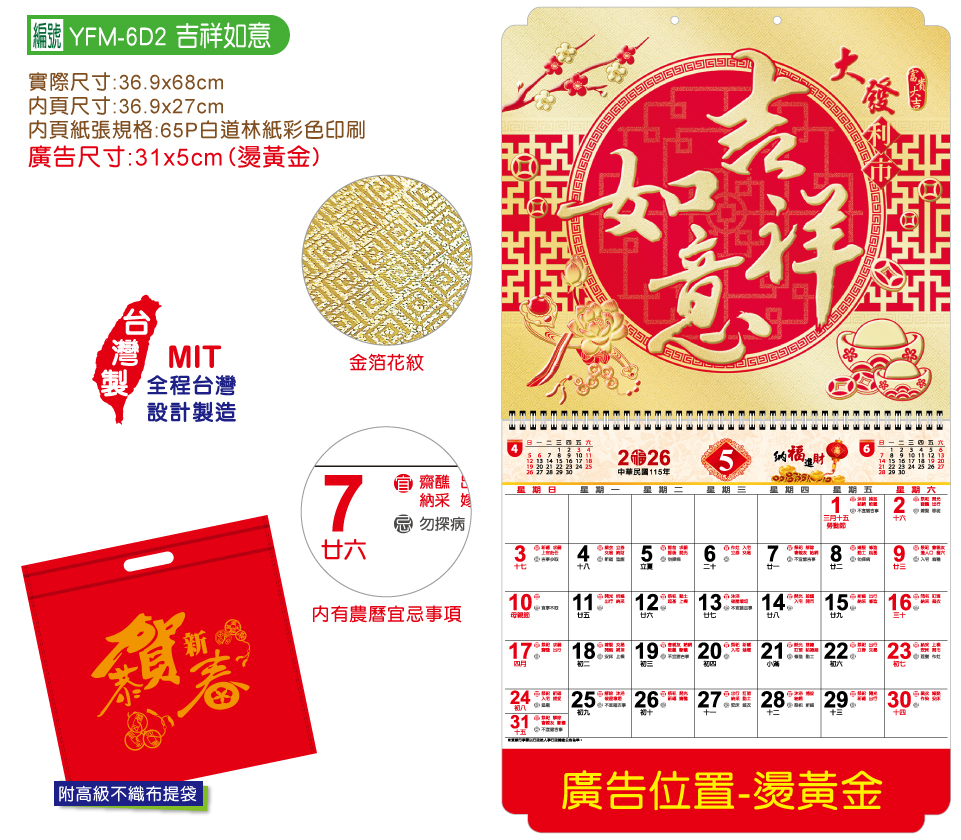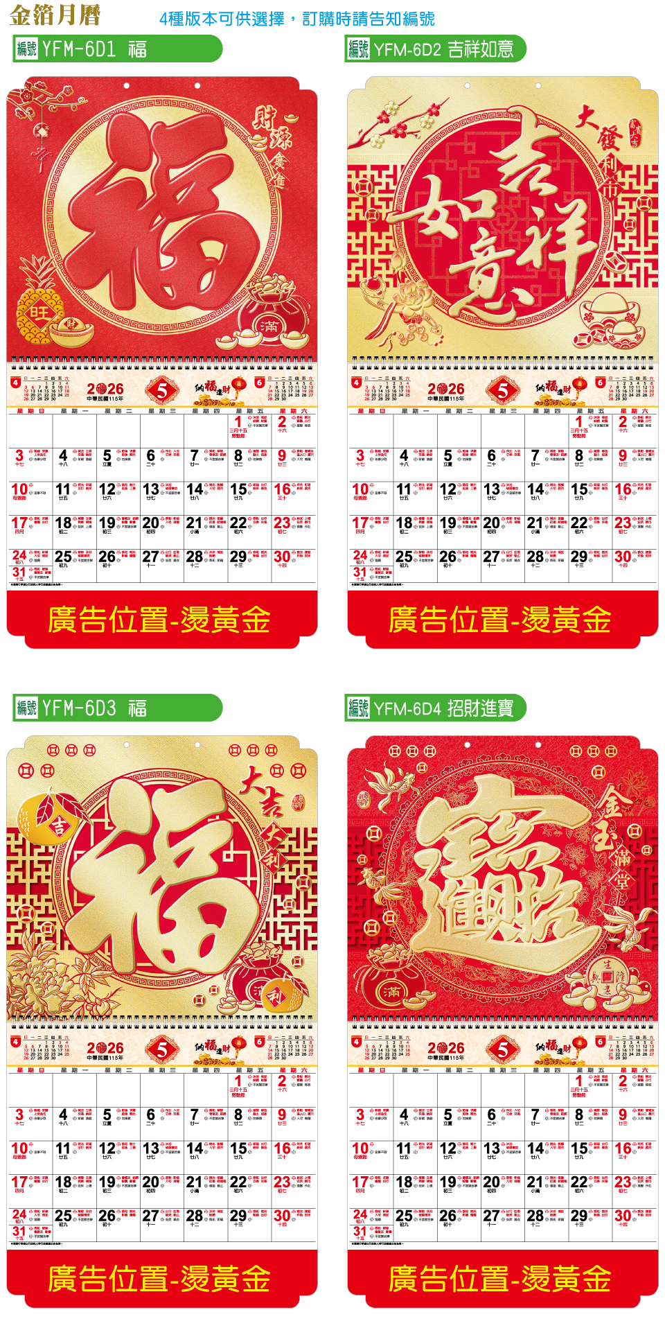 多樣設計:統義實業有限公司提供YFM-6D2吉祥如意【統義】2026年6K金箔福字月曆【月曆工廠】【掛式月曆】【出清品工廠】【燙金月曆】【超低價月曆】【過年月曆】【客製化月曆】【3000免運】的多樣化設計