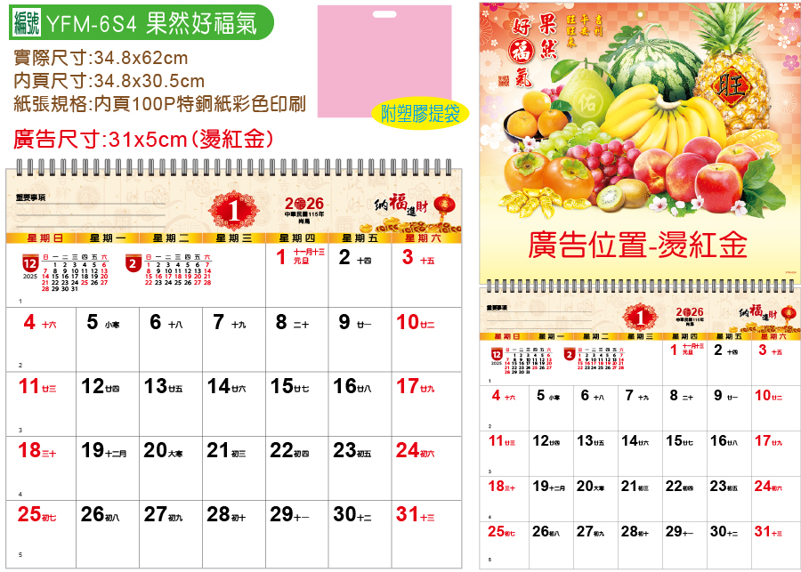 品質優良:掛版400P銅西卡/內頁100P特銅紙彩色印刷製造的統義實業YFM-6S4果然好福氣【統義】2026年小6K單面月曆【月曆工廠】【水果月曆】【2026月曆】【掛式月曆工廠】【出清品工廠】【超便宜工廠】【客製化製作工廠】【3000免運】,附塑膠提袋