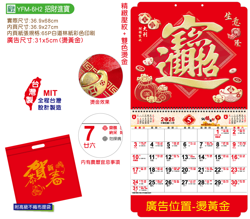 品質優良:精緻壓紋+雙色燙金掛版製造的統義實業YFM-6H2招財進寶【統義】2026年6K亮彩福字月曆【月曆工廠】【掛式月曆】【出清品工廠】【燙金月曆】【超低價月曆】【過年月曆】【客製化月曆】【3000免運】,附高級不織布提袋