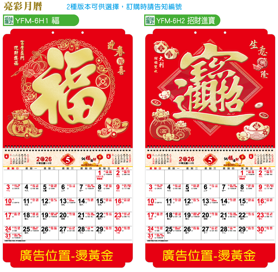 多樣設計:統義實業有限公司提供YFM-6H2招財進寶【統義】2026年6K亮彩福字月曆【月曆工廠】【掛式月曆】【出清品工廠】【燙金月曆】【超低價月曆】【過年月曆】【客製化月曆】【3000免運】的多樣化設計