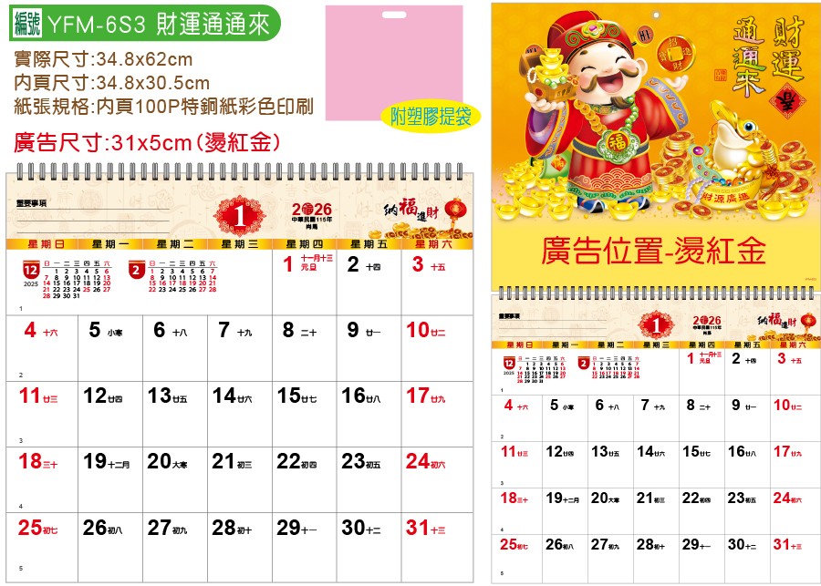 品質優良:掛版400P銅西卡/內頁100P特銅紙彩色印刷製造的統義實業YFM-6S3財運通通來【統義】2026年小6K單面月曆【月曆工廠】【財神月曆】【2026月曆】【掛式月曆工廠】【出清品工廠】【超便宜工廠】【客製化製作工廠】【3000免運】,附塑膠提袋