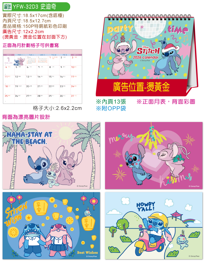 品質優良:150P特銅紙雙面彩色印刷(13張26頁)製造的統義實業YFW-32D3史迪奇【統義】2026年32K授權三角檯曆(13張)(小)【正版授權桌曆工廠】【2025授權桌曆工廠】【迪士尼授權桌曆工廠】【桌曆工廠】【客製化工廠】【三角檯曆工廠】【禮贈品工廠】【超便宜工廠】【3000免運】【史迪奇三角桌曆工廠】,正面月表,附自黏OPP袋