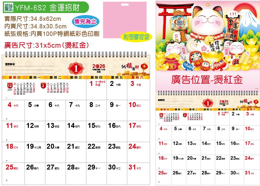 品質優良:掛版400P銅西卡/內頁100P特銅紙彩色印刷製造的統義實業YFM-6S2金運招財【統義】2026年小6K單面月曆【月曆工廠】【招財貓月曆】【2026月曆】【掛式月曆工廠】【出清品工廠】【超便宜工廠】【客製化製作工廠】【3000免運】,附塑膠提袋