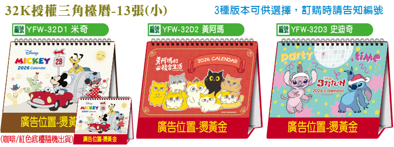 多樣設計:統義實業有限公司提供YFW-32D2黃阿瑪【統義】2026年32K授權三角檯曆(13張)(小)【正版授權桌曆工廠】【2026授權桌曆工廠】【黃阿瑪授權桌曆工廠】【桌曆工廠】【客製化工廠】【三角檯曆工廠】【禮贈品工廠】【超便宜工廠】【3000免運】的多樣化設計
