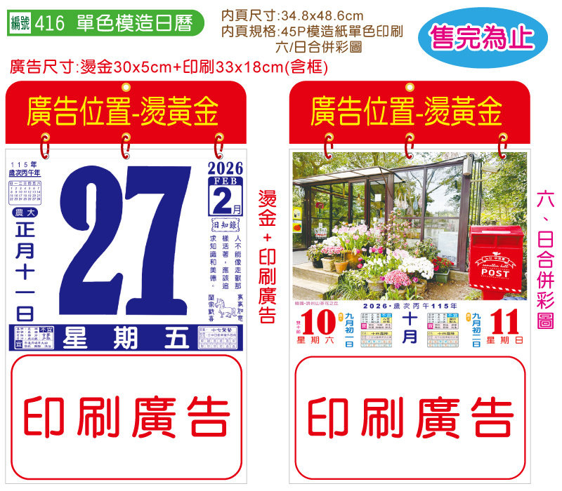 品質優良:45P模造紙單色印刷製造的統義實業416-4K直式日曆【統義】2026-4K單色模造日曆【日曆工廠】【2026日曆工廠】【掛曆工廠】【出清品工廠】【客製化日曆】【彩色日曆】【超低價日曆】【直式日曆】【3000免運】